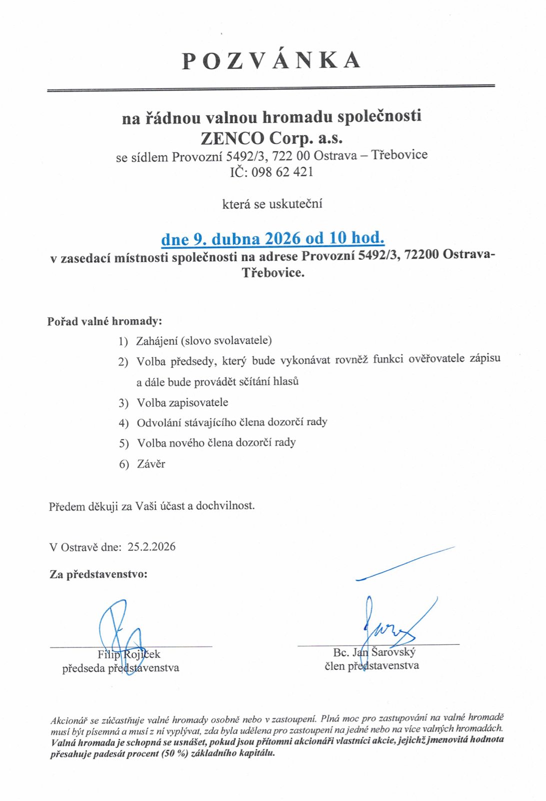 Pozvánka na valnou hromadu ZENCO Corp. a.s.